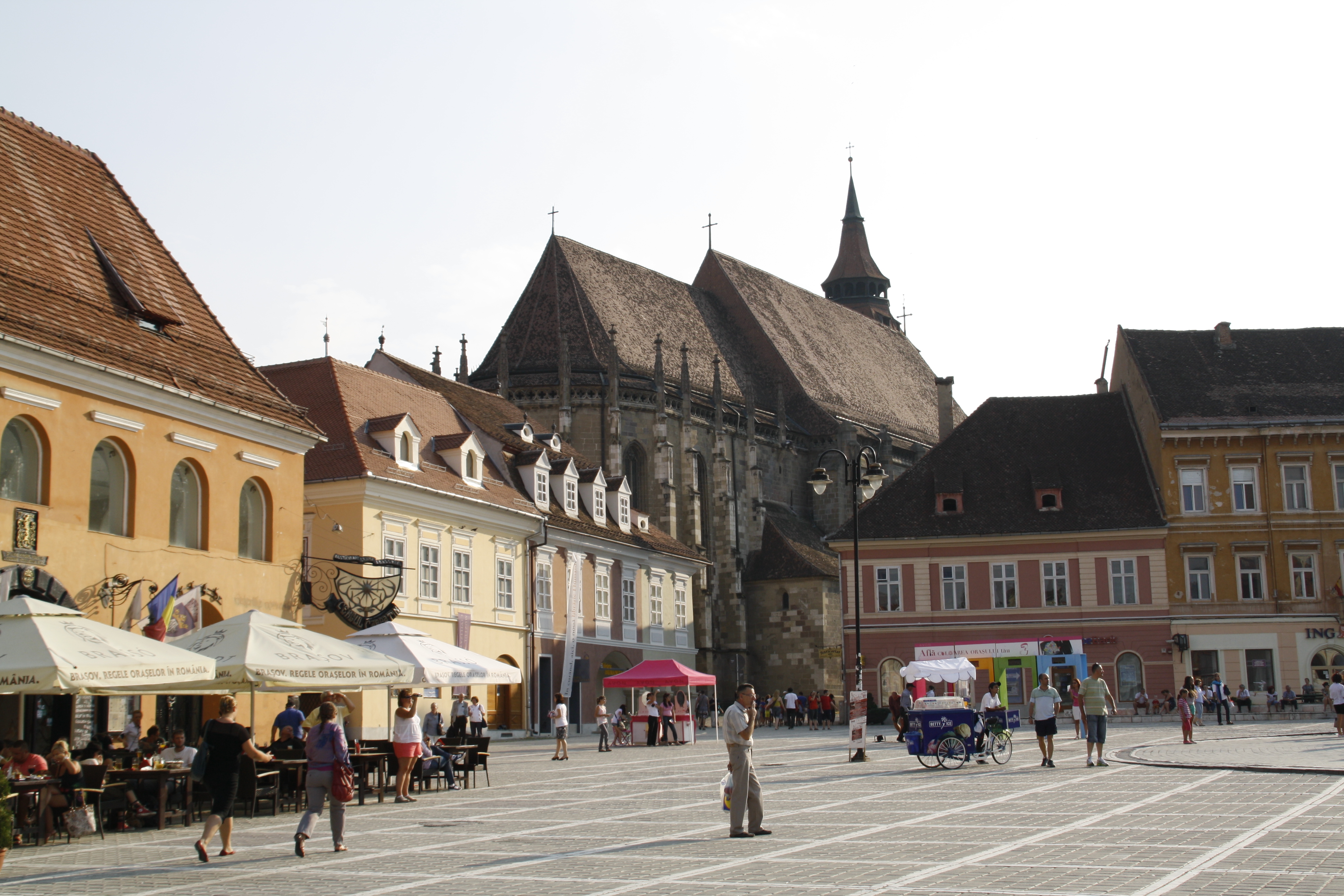Im Folgenden schliefen wir gut, erst als die Sonne durch die wackelnden Vorhänge schien, erwachten wir langsam. Wir putzen Zähne und verbrachten die nächsten Stunden damit, zu frühstücken (mitgebrachtes pumpernickelartiges Brot mit sehr gewöhnungsbedürftig aussehendem Hühner-Dosenfleisch und Marmelade [die ich bevorzugte]), die Landschaft vorbeiziehen zu sehen und uns mit dem österreichischen Abteilkollegen zu unterhalten. Der fuhr, wie wir erfahren durften, auch nach Brasov – zu seiner Freundin und zum Wandern. Als wir so da saßen und die Pferdewagen auf den Feldern kommentierten, trat unsere „Aufsichtsperson“ ein – die Frau, die am Abend zuvor unsere Tickets eingesammelt und die Bettwäsche verteilt hat. Von ihr bekamen wir alle Dokumente zurück und außerdem noch jeder eine Packung Salzstangen – so war der Preis, den wir für den Schlafwagen gezahlt haben gleich viel erträglicher. Als Brasov dann in Sichtweite war, kam die Frau erneut und teilte uns mit: In 20 Minuten werden wir ankommen. Nach sagenhaften 8 Minuten stand der Zug in Brasov am Bahnhof. 12 Minuten zu früh, und doch eine Stunde zu spät. Verabschiedet vom Österreicher, machten wir uns auf die Suche nach unserem Hostel. Unterwegs statteten wir der Bank noch einen Besuch ab. Der erste Eindruck der Stadt war leider nicht der Beste. Der neuere Teil ist von Plattenbau geprägt, viele Gebäude befinden sich im Bau und man fragt sich ständig: Wie lange schon? Die Länden links und rechts am Straßenrand wirkten schmuddelig, dass einzig fröhliche waren die Vögel, die bei jeder Gelegenheit an jeglichen Bankautomaten durch den Bildschirm flogen.