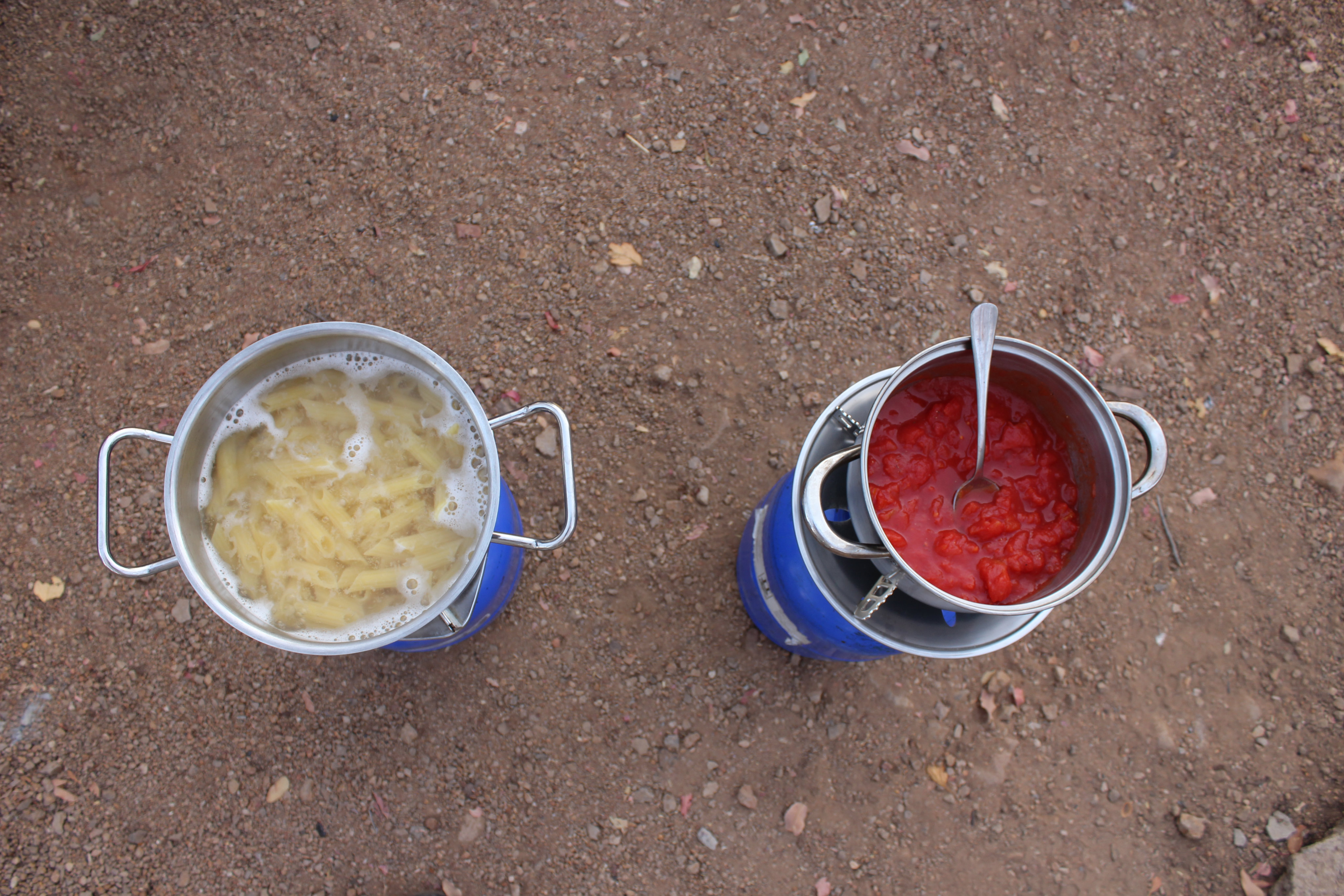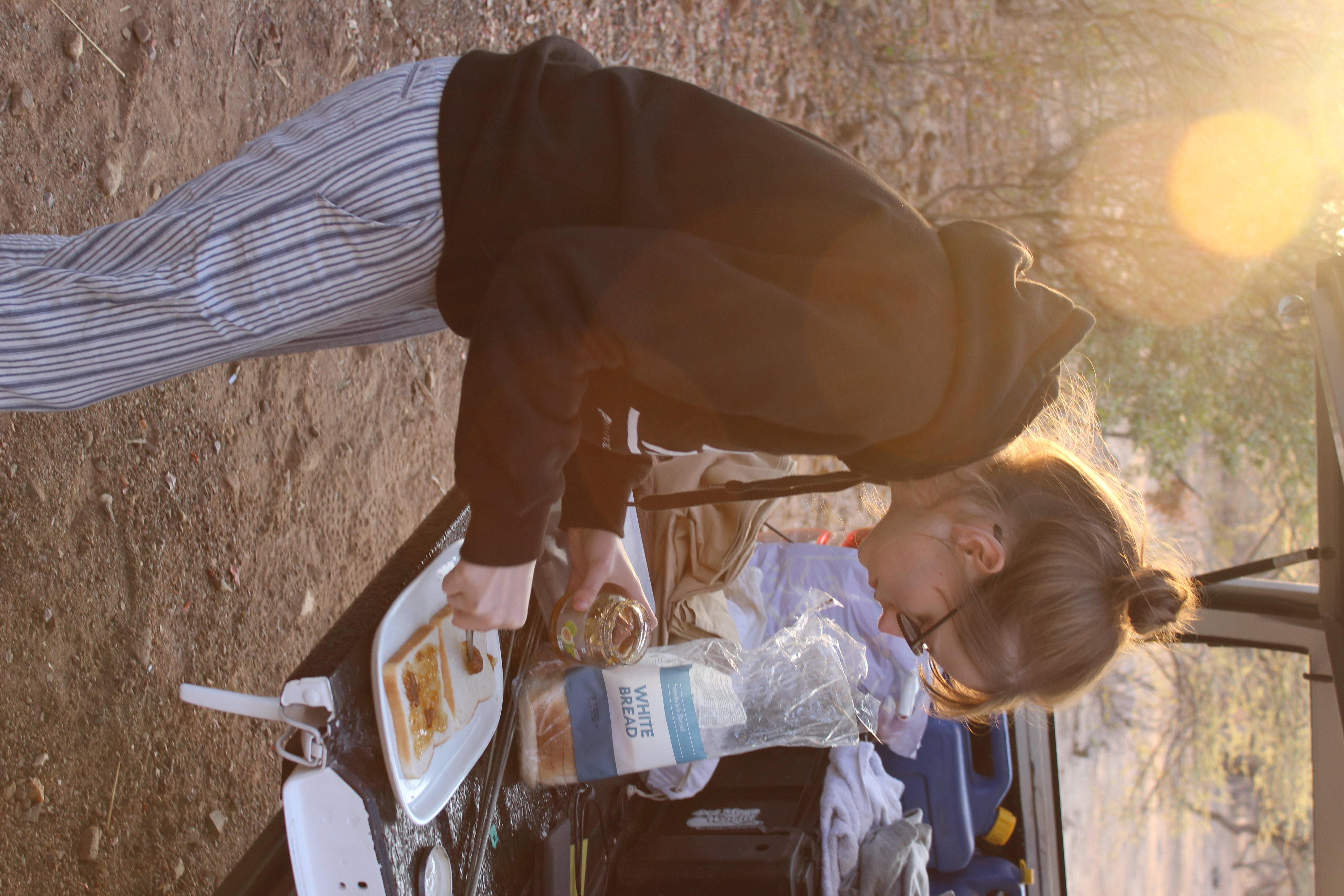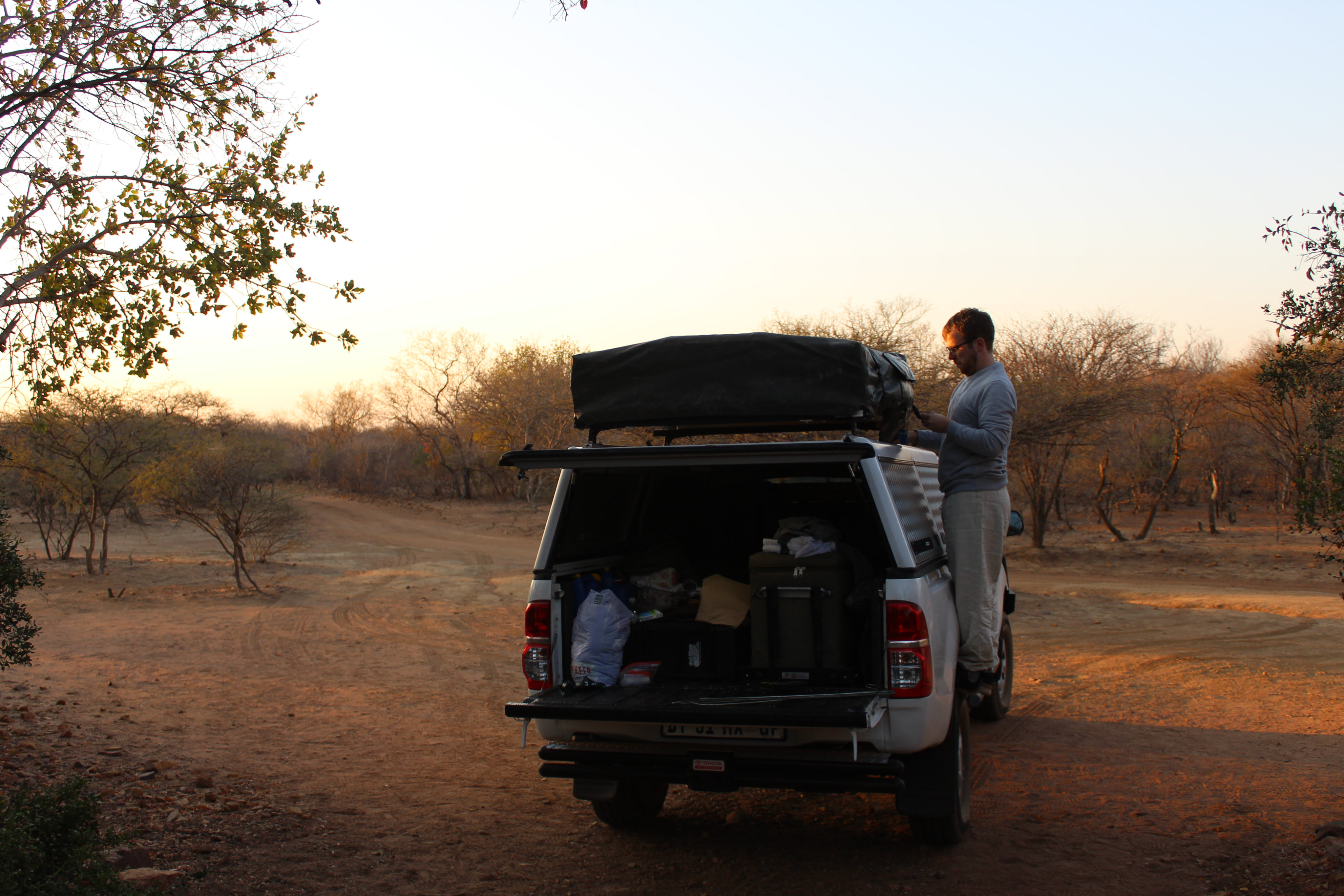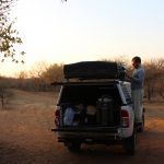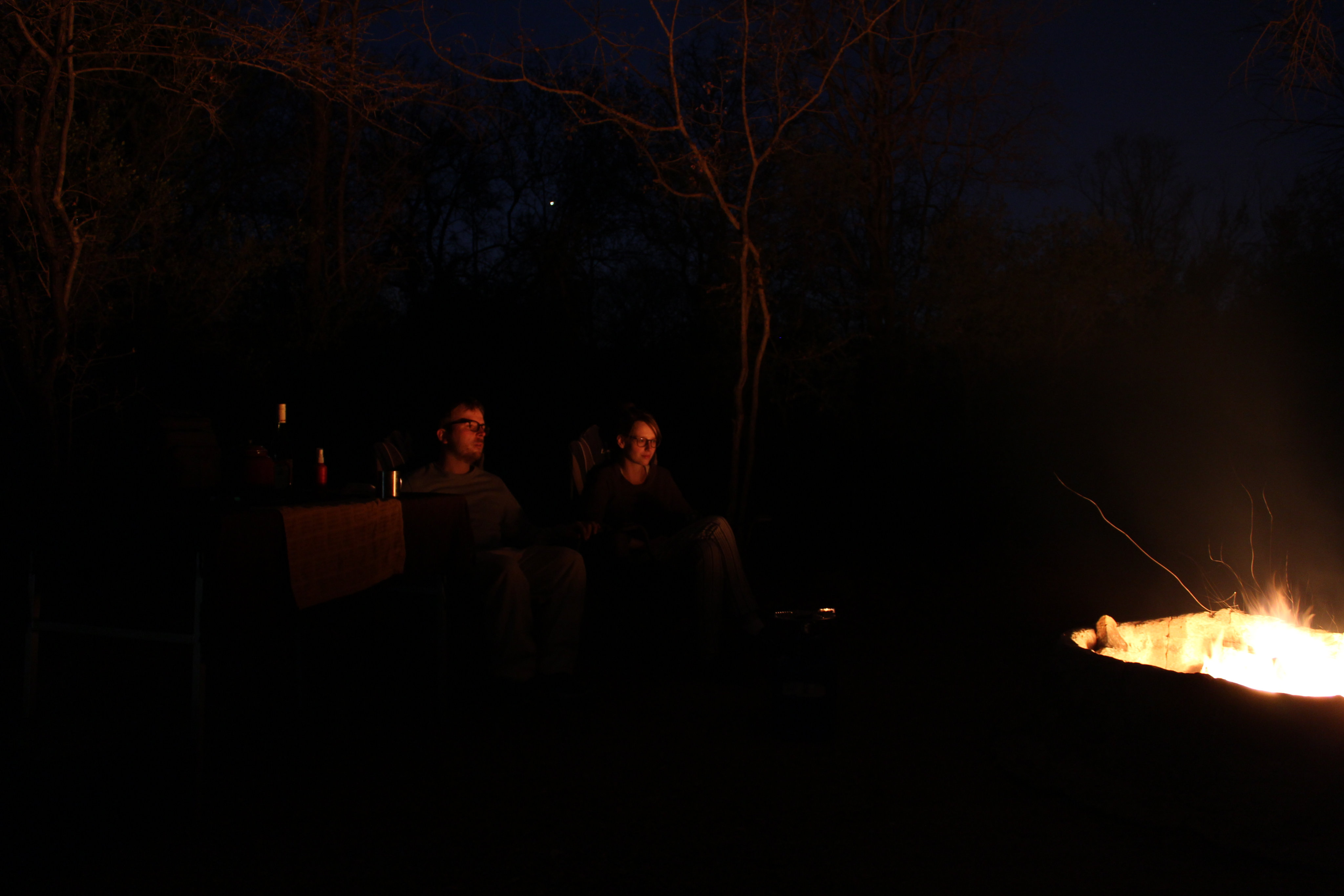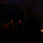 Am Abend saßen wir dann an unserem ersten, noch nicht ganz perfektem, Lagerfeuer (Streichhölzer, Grillanzünder und Feuerholz kauften wir an der Rezeption), genossen unser spartanisches Mahl (Nudeln mit Tomatensoße – die einzige Gewürze die wir besaßen waren die kleinen Salz- und Pfefferpäckchen aus dem Flugzeug) und eine Flasche Wein. Der Sternenhimmel war ein wirklicher Traum, die in der Nähe campenden Securityguards sehr freundlich und der Abend verging schnell. Immer wieder bemerkenswert ist jedoch wie schnell es dunkel wird. Schon kurz nach 7 ist es so finster, dass man meint es wäre bereits Mitternacht. Das verschiebt auch gewaltig den Biorhytmus: Zwischen 9 und 10 legt man sich schlafen und steht um 6 Uhr morgens wieder auf.