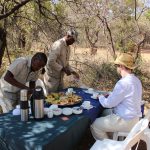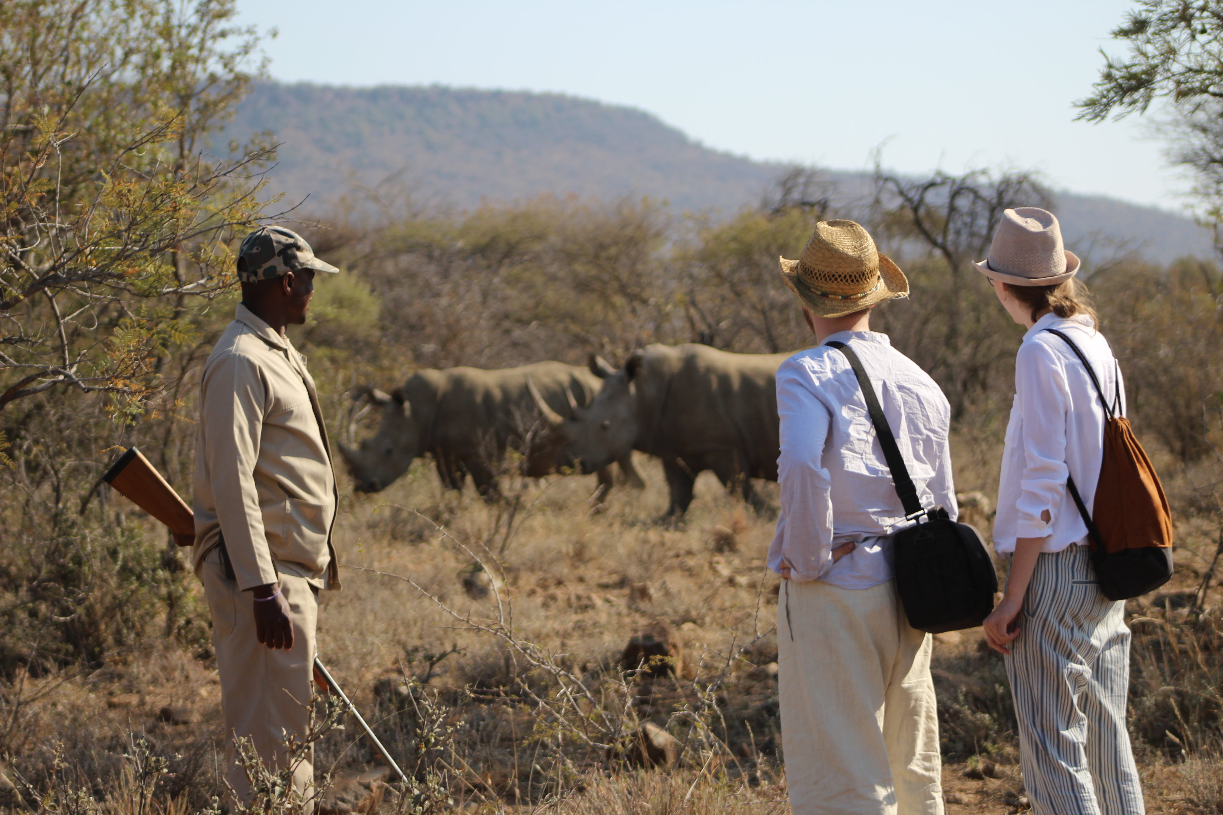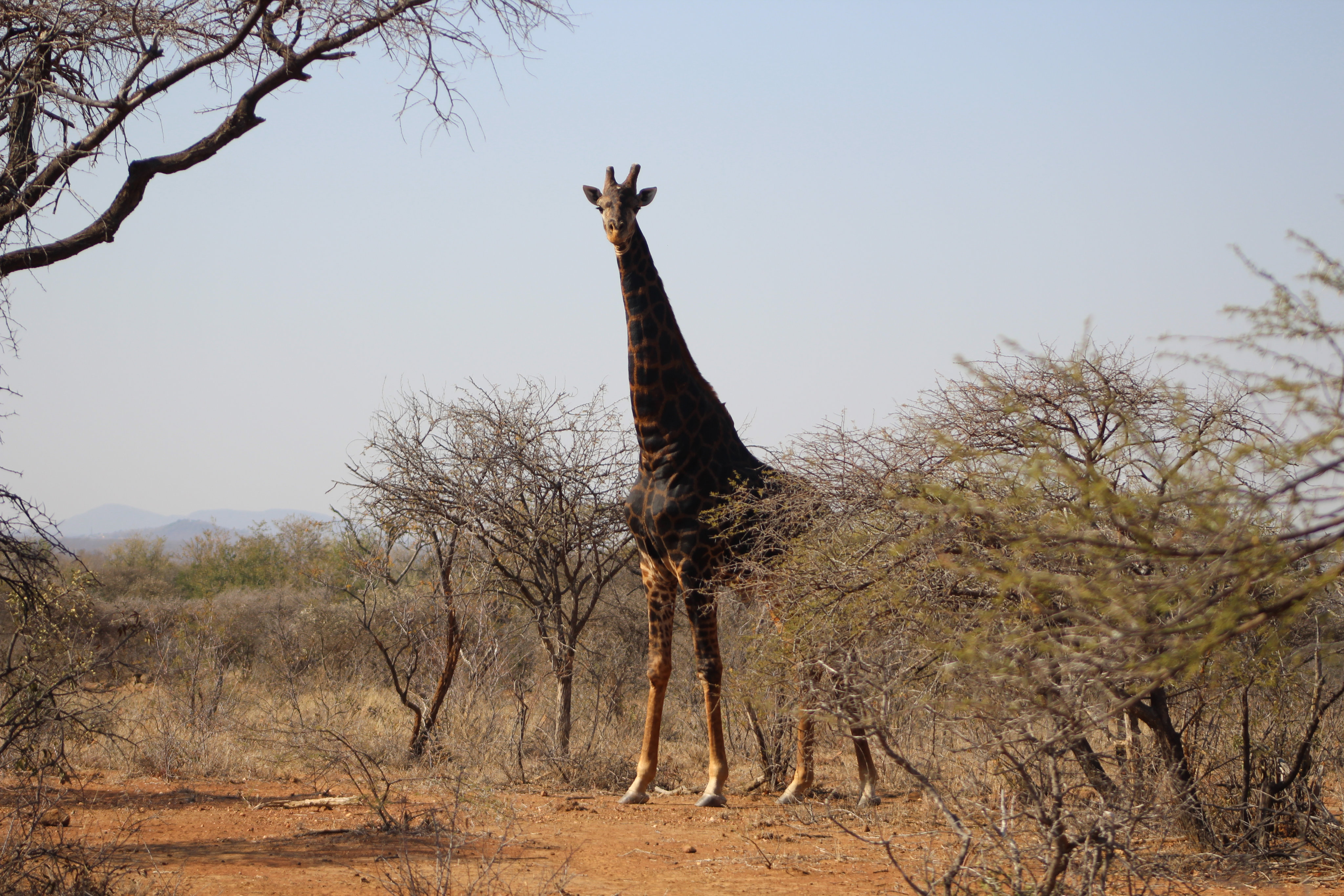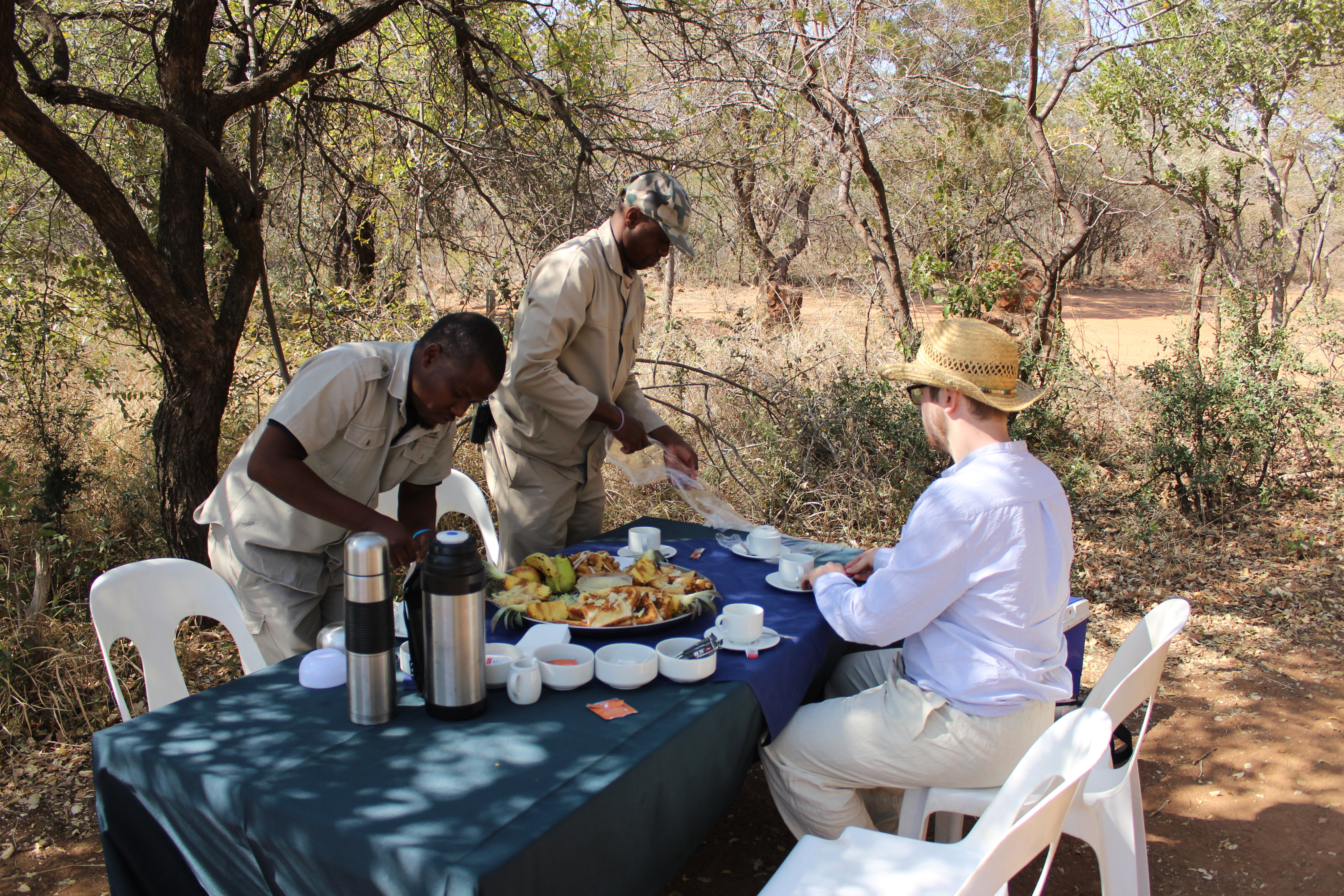 Highlight des Tages war zweifelsohne das Giraffe-Tracking. Wir sahen nicht nur eine Giraffe, sondern auch die sehr seltenen Nashörner, einige Impalas, Kudus, Warzenschweine und viele andere Tiere. Darüberhinaus waren unsere beiden Guides sehr freundlich und erzählten uns nicht nur woran man Giraffenspuren erkennt, sondern – während des Picknicks – auch viel über ihr Land und ihr Leben.